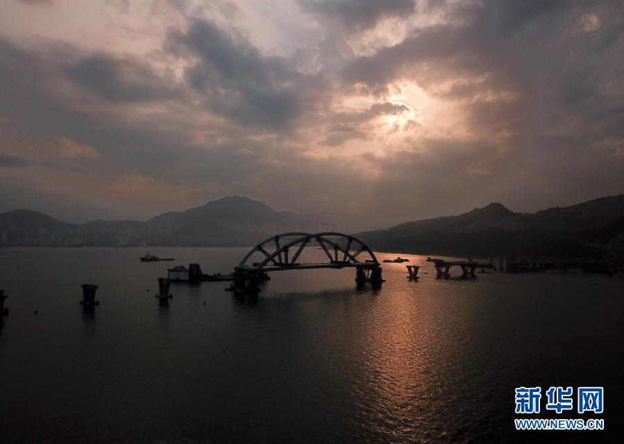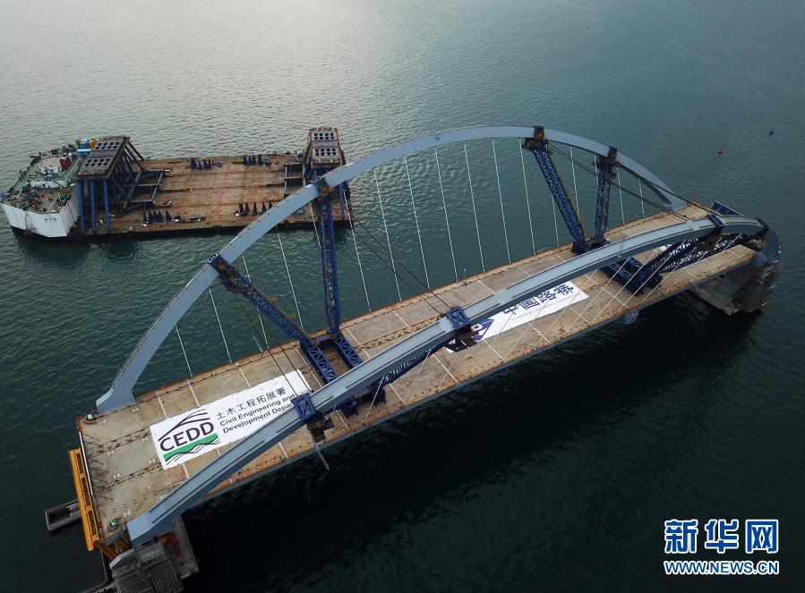 “冒出來”的并不是一座完整的大橋,而是一段跨徑長達(dá)200米的雙拱鋼橋,在海面中央兀然矗立?!斑@是我們大橋工程最核心的主橋部分,技術(shù)難度最大,對整個(gè)項(xiàng)目有里程碑的意義。”承建單位中國路橋工程有限公司董事、項(xiàng)目總指揮闞軍說。