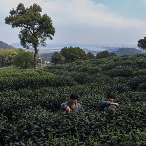 3月12日,在位于杭州市西湖風(fēng)景名勝區(qū)滿覺(jué)隴村白鶴峰的西湖龍井茶葉基地,茶農(nóng)在采摘西湖龍井頭茶,遠(yuǎn)處就是杭州西湖。