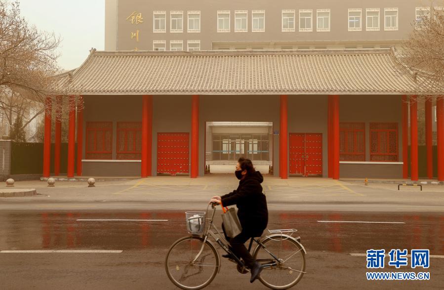 3月15日,在寧夏銀川市興慶區(qū)文化街,市民在沙塵中騎行。當(dāng)日,我國(guó)北方多地出現(xiàn)沙塵天氣。新華社記者 楊植森 攝