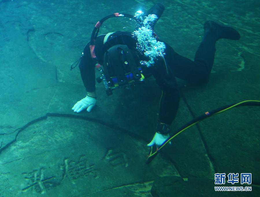 3月15日,在長江水下40多米的白鶴梁題刻無壓容器罩內(nèi),潛水員在對題刻上的泥沙進(jìn)行清理。新華社記者 王全超 攝