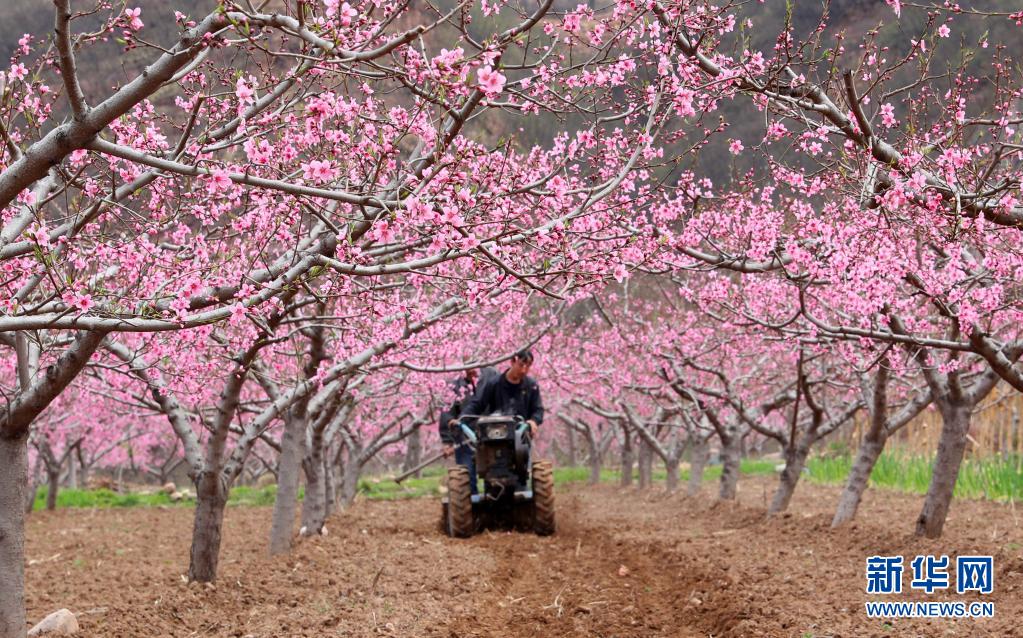 4月5日,河北省石家莊市井陘縣測(cè)魚(yú)鎮(zhèn)楊莊村村民駕駛農(nóng)機(jī)在桃園里作業(yè)。