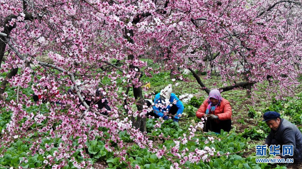 4月6日,甘肅省隴南市宕昌縣城關鎮(zhèn)玉地河村群眾在桃樹下采挖小白菜。