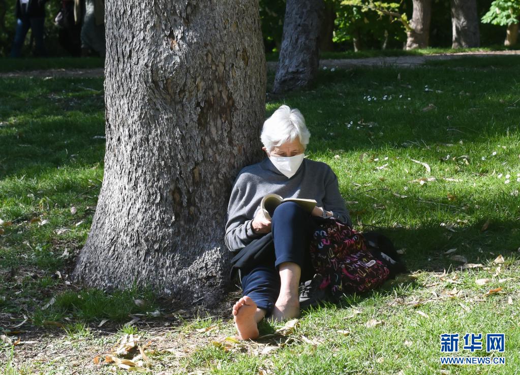 4月17日,一位老人在西班牙馬德里一個(gè)公園內(nèi)讀書。