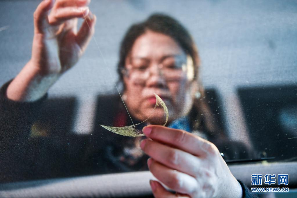 陳英華在位于蘇州高新區(qū)鎮(zhèn)湖街道的蘇繡工作室內(nèi)刺繡(4月14日攝)。新華社記者 李博 攝