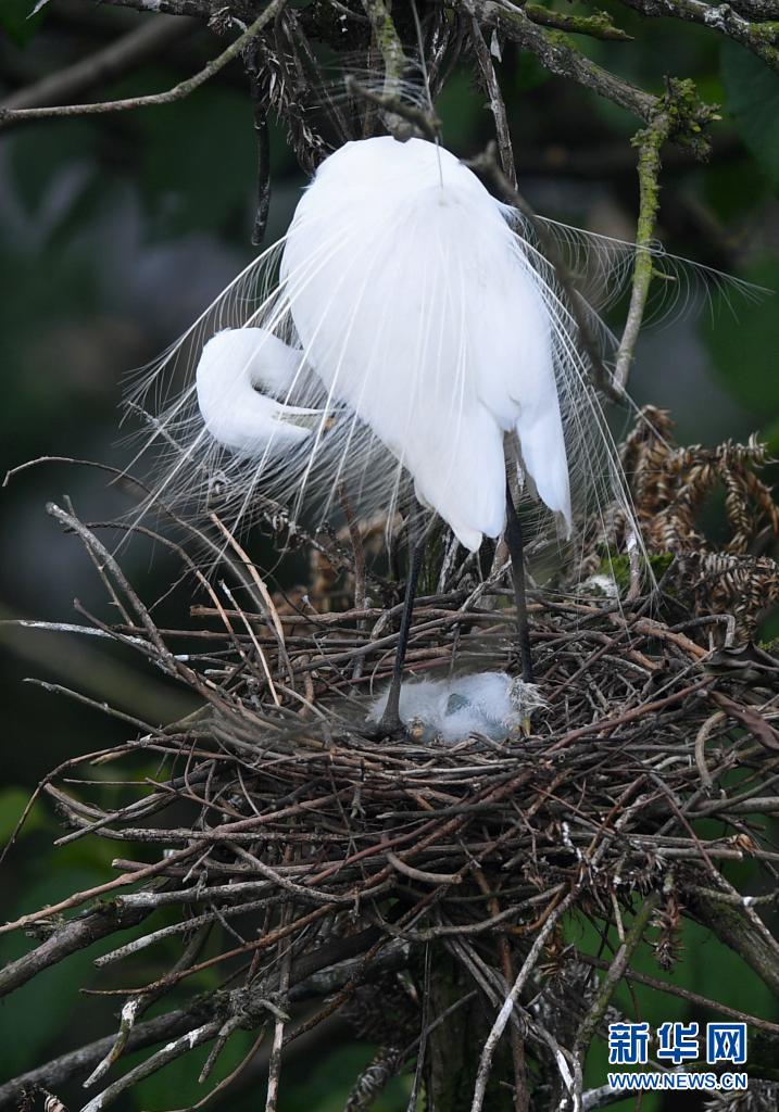 在南昌市新建區(qū)象山森林公園內(nèi),白鷺守護(hù)著雛鳥(niǎo)(5月18日攝)。