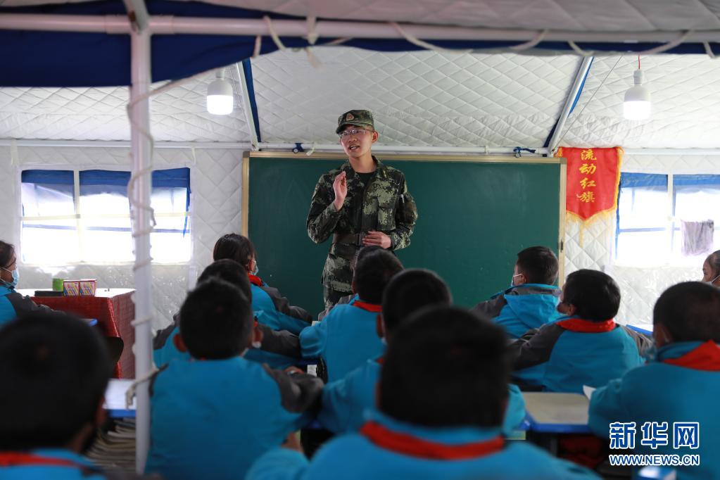 5月24日,武警青海總隊(duì)果洛支隊(duì)機(jī)動(dòng)大隊(duì)排長(zhǎng)張國(guó)睿為花石峽鎮(zhèn)藏文中心寄宿制小學(xué)的孩子上課。新華社記者 劉芳 攝
