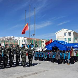 當(dāng)日是青海果洛瑪多縣花石峽鎮(zhèn)藏文中心寄宿制小學(xué)震后復(fù)學(xué)第一天,學(xué)校邀請(qǐng)他以“國(guó)家、奮斗、團(tuán)結(jié)”為主題,和孩子們進(jìn)行交流。