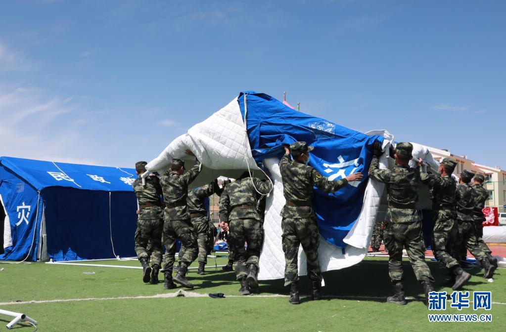 5月24日,武警青??傟?duì)果洛支隊(duì)機(jī)動大隊(duì)官兵為花石峽鎮(zhèn)藏文中心寄宿制小學(xué)搭建帳篷教室。新華社記者 劉新 攝