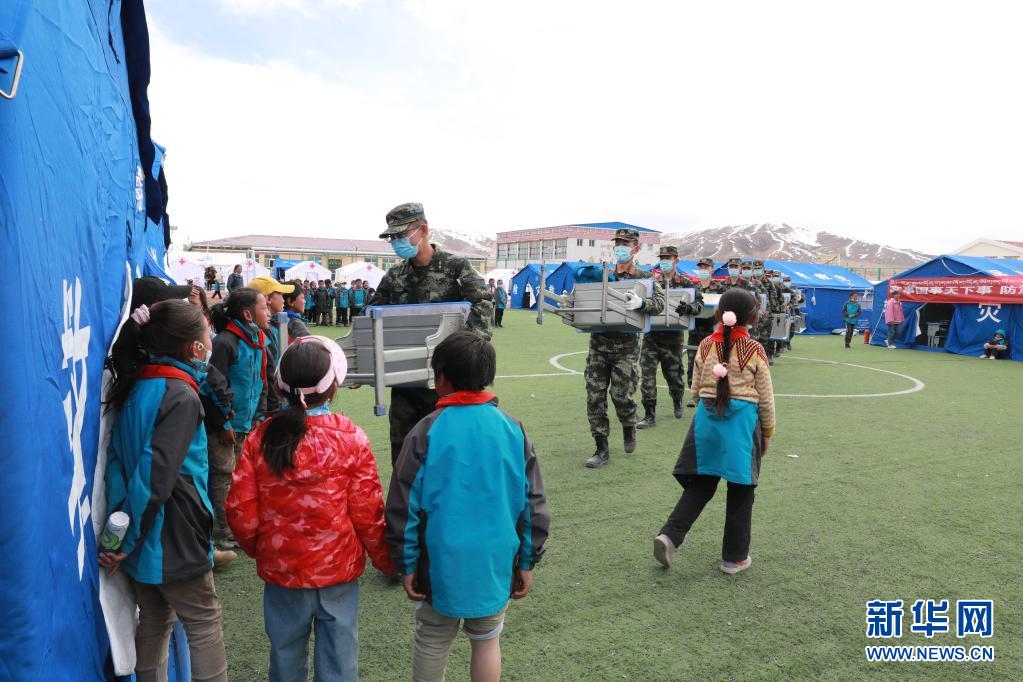 5月24日,武警青海總隊果洛支隊機動大隊排長張國睿(前一)和戰(zhàn)友為花石峽鎮(zhèn)藏文中心寄宿制小學的帳篷教室搬運課桌。新華社記者 劉芳 攝