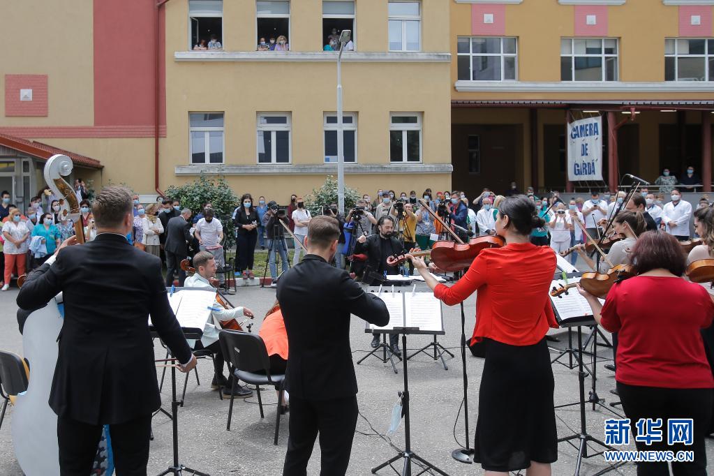 當日,羅馬尼亞首都布加勒斯特一個樂隊在該國一家傳染病醫(yī)院——馬太·巴爾什醫(yī)院演出,向抗擊新冠疫情的醫(yī)務(wù)工作者致謝。