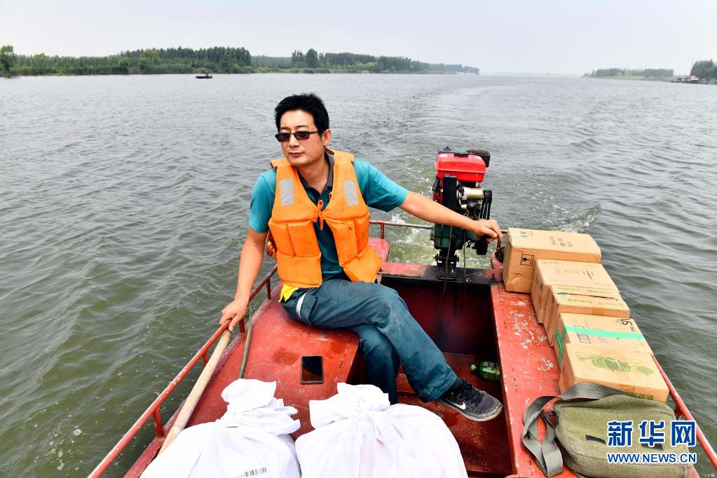 6月20日,在微山縣南陽鎮(zhèn),郵遞員王少朋駕駛郵船為村民投遞郵件。