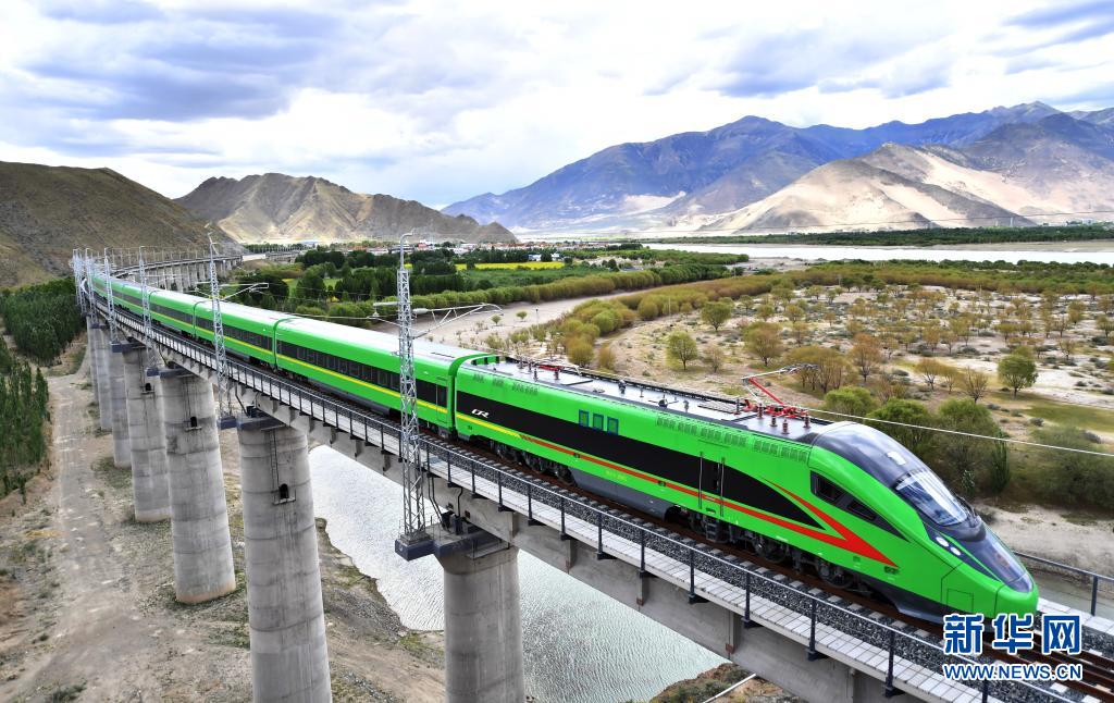 試運(yùn)行的復(fù)興號列車行駛在西藏山南市境內(nèi)(6月16日攝)。