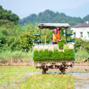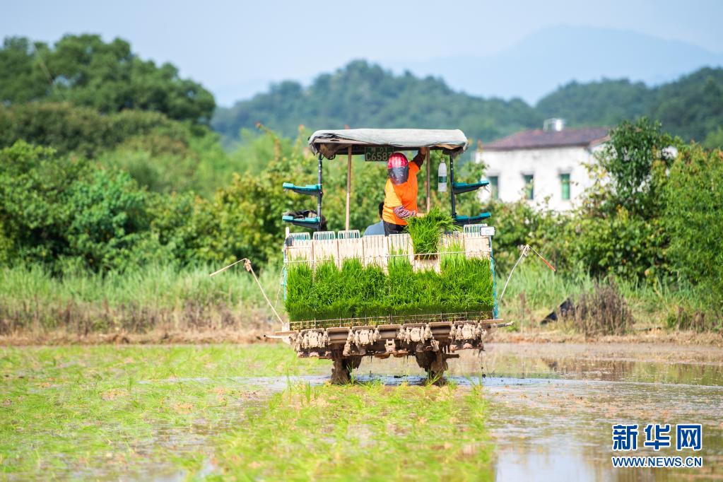 6月26日,湖南瀏陽龍伏鎮(zhèn)新開村村民駕駛插秧機(jī)在田間插秧。