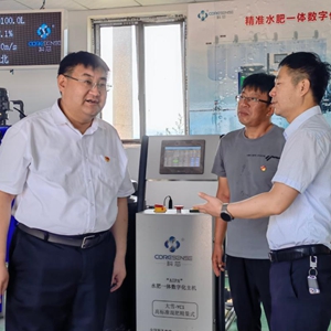 6月23日,劉偉(左一)在太谷區(qū)閆村科芯園區(qū)水肥一體化車間調(diào)研。新華社發(fā)