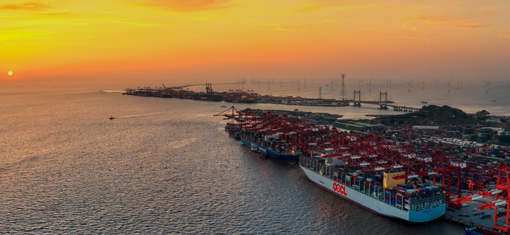清晨六点,上海洋山港四期自动化码头,AGV(全自动无人导引车)上一只红色集装箱伴着霞光移动,经由桥吊远程操作被稳稳抓起,精准吊装搬运到远洋班轮的甲板上。这个全球单体规模最大、智能化程度最高的全自动化集装箱码头,24小时不间断作业,一个昼夜的吞吐量可超27000标准箱。