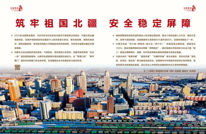 ◇内蒙古立足边境地区地形复杂、气候恶劣、管控难度大的实际,构建党政军警民“五位一体”强边固防新格局,以数字化赋能提升强边固防科技实力,在“智慧口岸”“数字国门”建设中织密国门安全防护网,形成兼顾安全与发展的多元防控体系。