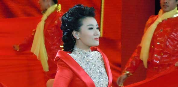 譚晶著中國紅長裙獻(xiàn)唱