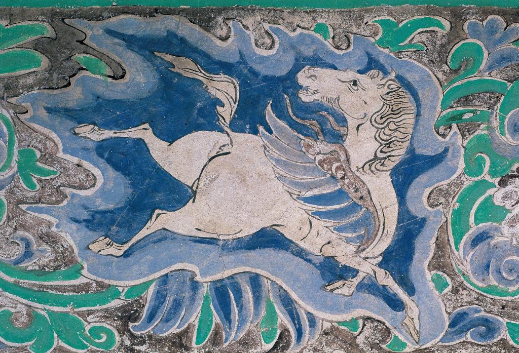 古人对马充满了浪漫想象。在有莫高窟“姊妹窟”之称的榆林窟,第10窟藻井外围的装饰花边绘有一匹通体白色、回首奔驰的翼马。王嘉奇介绍,白马有着蓝色羽翼,两条前腿交叉腾踏,两条后腿凌空飞奔,臀部和大腿肌肉发达。翼马造型简练、体态优美,是同题材的佳作。