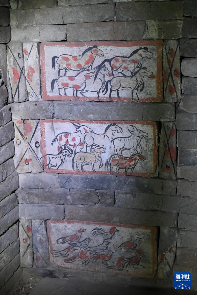 在嘉峪关魏晋墓六号墓的画像砖上,绘有魏晋时期河西地区牛羊成群的景象(5月10日摄)。