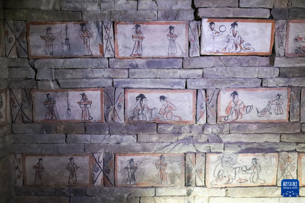 在嘉峪关魏晋墓六号墓的画像砖上,绘有男主人宴请宾客的画面,内容表现了仆人在加工烤肉、蒸食物、端着托盘给主人用餐的场景(5月10日摄)。
