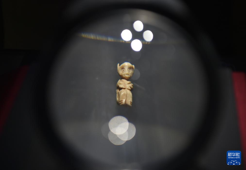 这是8月12日在位于河南省洛阳市偃师区的二里头夏都遗址博物馆拍摄的骨猴。