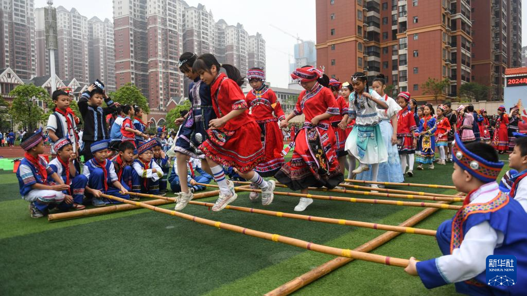4月10日,老师和孩子们在广西南宁市逸夫小学庆祝“三月三”。