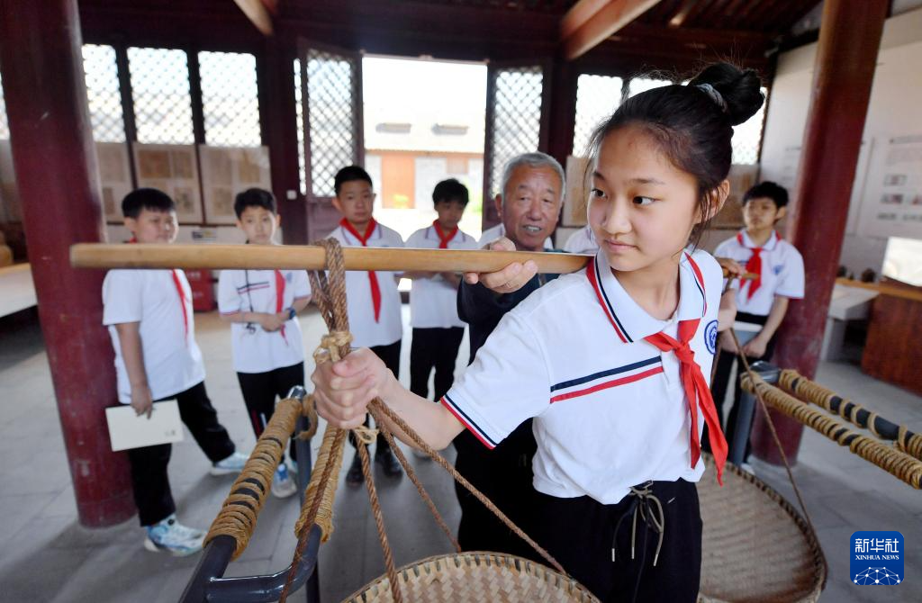5月16日,学生在深州市粮仓博物馆体验挑运东西。