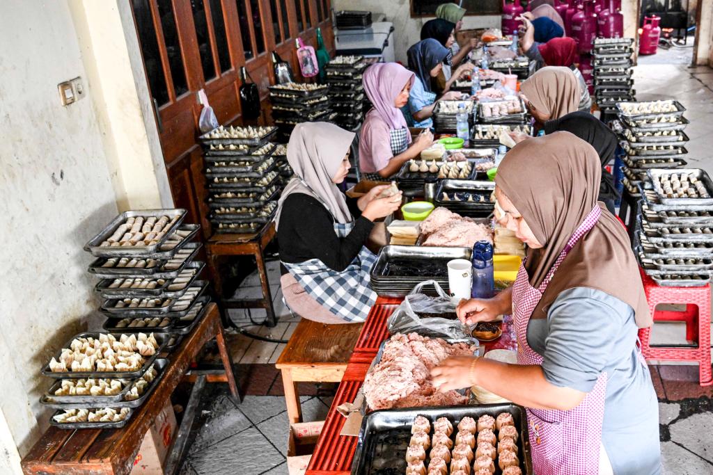 1月14日,在印度尼西亚南唐格朗,工人在一家点心作坊制作点心。