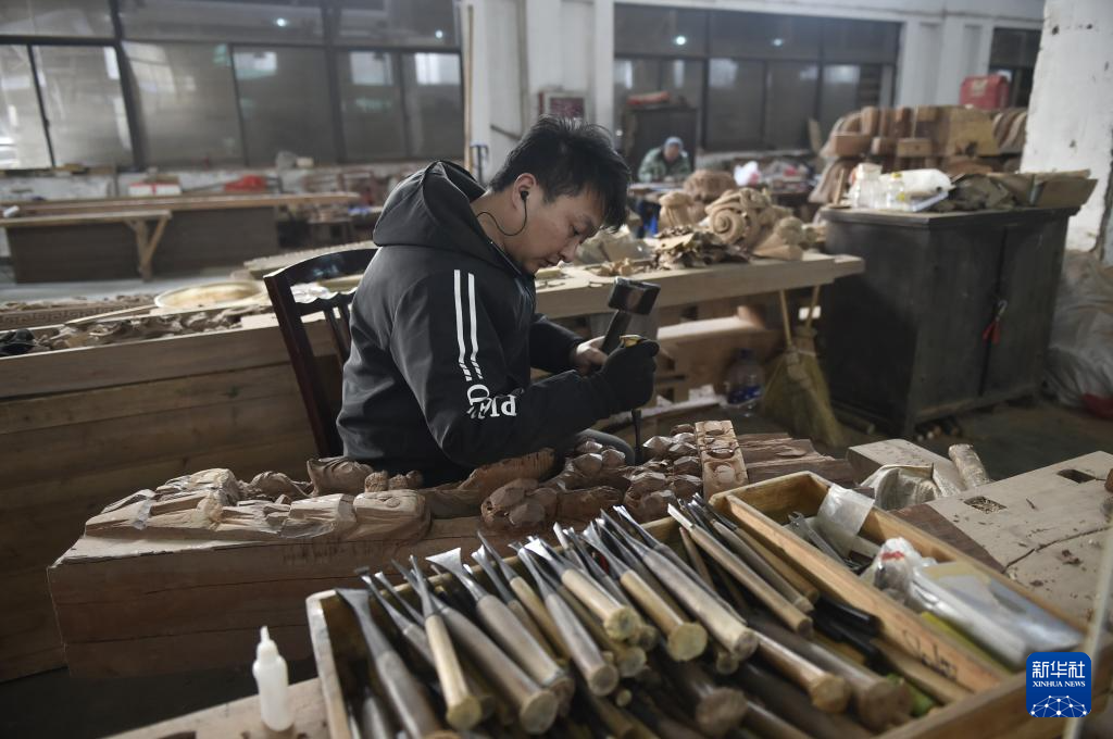 1月6日,工匠在黄山徽匠园林古建有限公司厂区雕刻徽派仿古建筑构件。