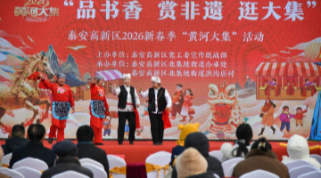 2月3日,在河南省信阳市光山县司马光广场年货市场,市民与舞狮表演艺人互动。