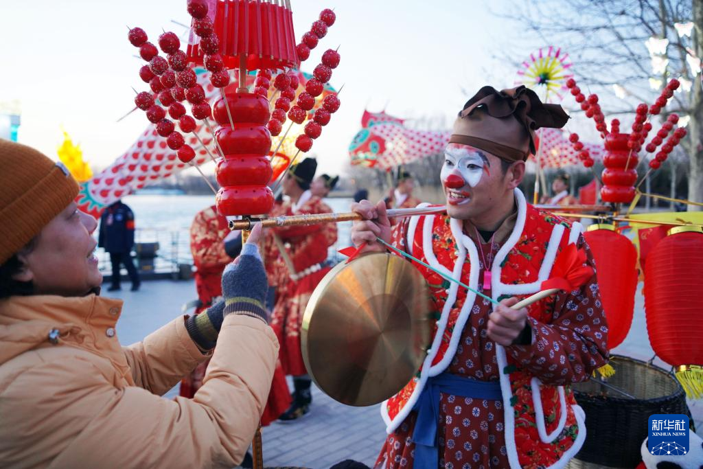2月10日,游园的小朋友与演员一起表演节目。