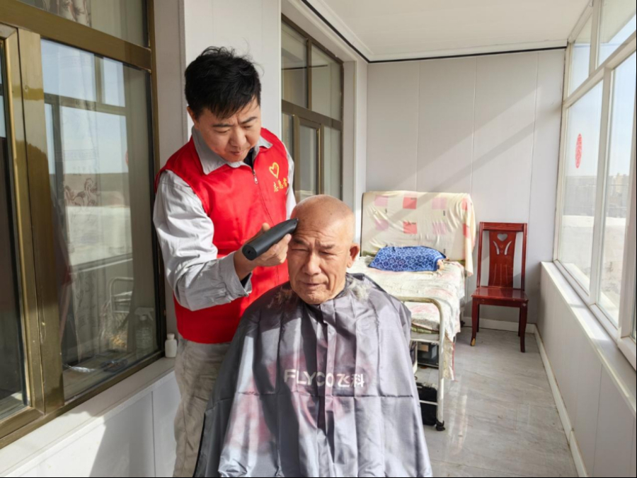 图为乌力吉检修人员为牧民大爷理发 张晋宇 摄