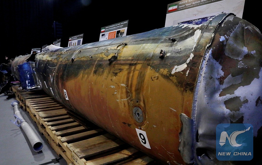 A missile confirmed as a "Qiam" ballistic missile manufactured in Iran and fired by Houthi rebels from Yemen into Saudi Arabiis seen on display. (Reuters Photo)