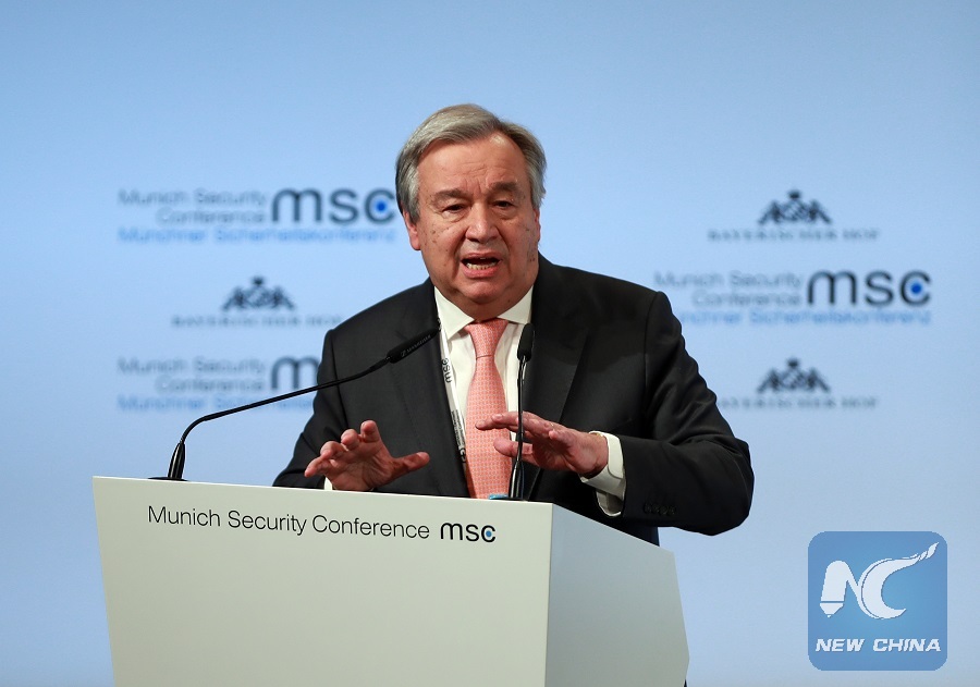 UN Secretary-General Antonio Guterres speaks during the 54th Munich Security Conference (MSC) in Munich, Germany, Feb. 16, 2018.(Xinhua/Luo Huanhuan)