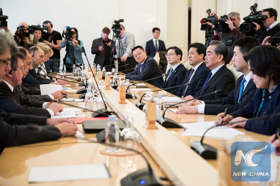Chinese President Xi Jinping's special envoy, State Councilor and Foreign Minister Wang Yi holds talks with Russian Foreign Minister Sergei Lavrov in Moscow, Russia, on April 5, 2018. (Xinhua/Wu Zhuang)