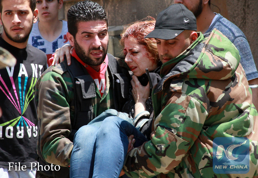 People transfer a woman, who was injured by a mine that went off in Bustan al-Diwan neighborhood in the old city of Homs, Syria, on Saturday, May 10, 2014. (Xinhua/Bassem Tellawi)
