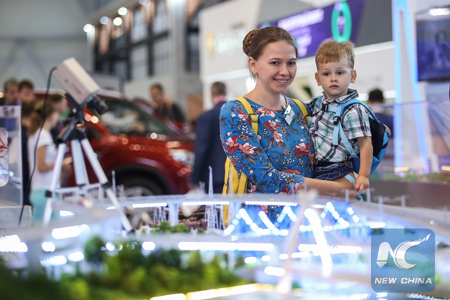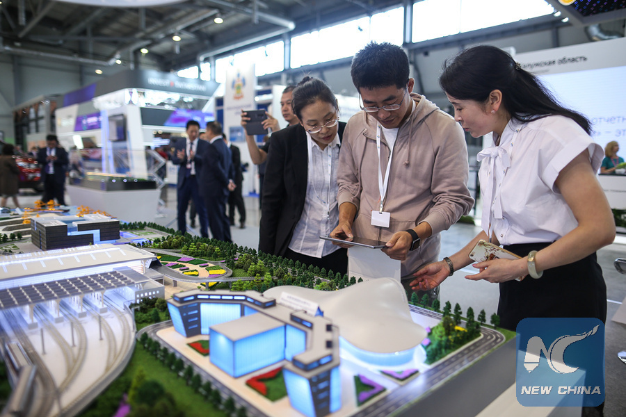 People look at the exhibit during the Russia-China expo at Innoprom Exhibition-2018 in Yekaterinburg, Russia, on July 9, 2018. (Xinhua/Evgeny Sinitsyn)