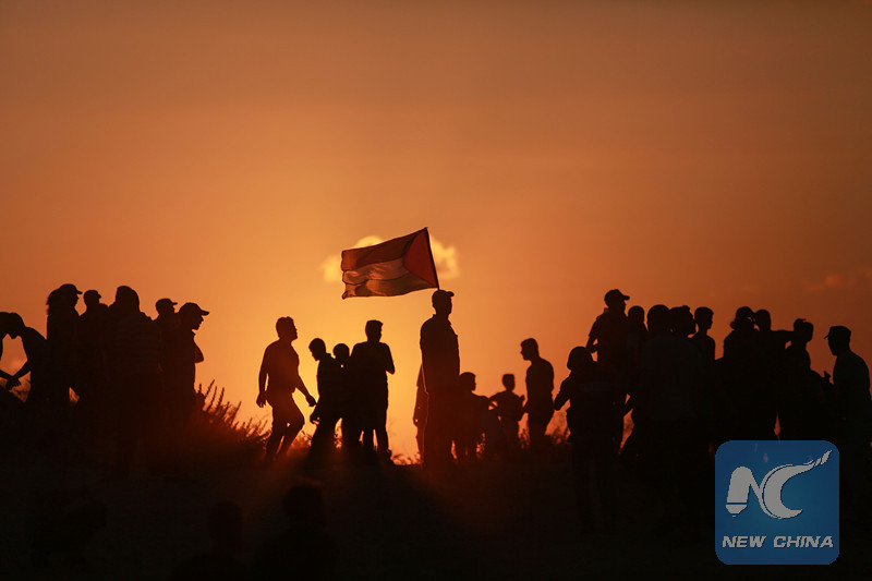 Palestinian protesters are silhouetted against sunshine during clashes with Israeli troops near the border between the northern Gaza Strip and Israel, on Sept. 17, 2018. (Xinhua/Stringer)