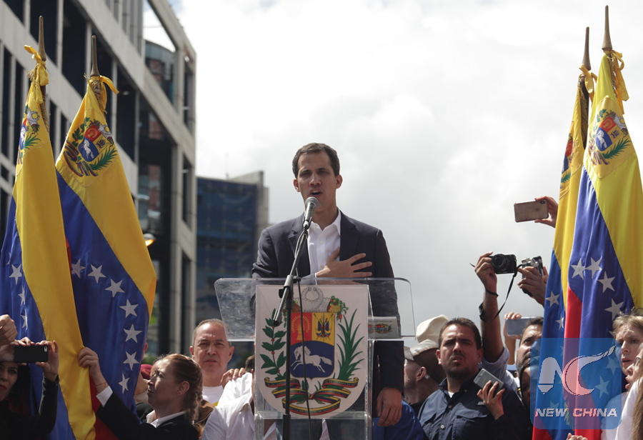 Juan Guaido (C), head of the opposition-controlled National Assembly, delivers a speech at the Francisco de Miranda avenue, in Caracas, Venezuela, on Jan. 23, 2019. (Xinhua/Boris Vergara)