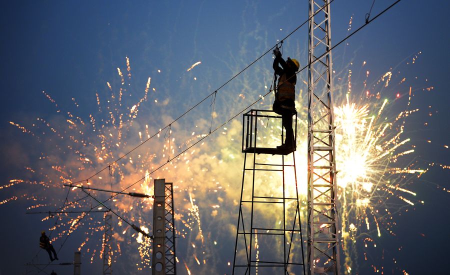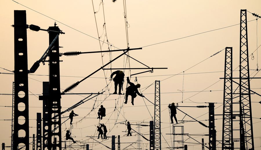 Electricians set the electric system for a railway line linking Xinfeng and Yaocun in Xi'an, capital of northwest China's Shaanxi Province, Jan. 7, 2020.(Xinhua/Liu Xiao)