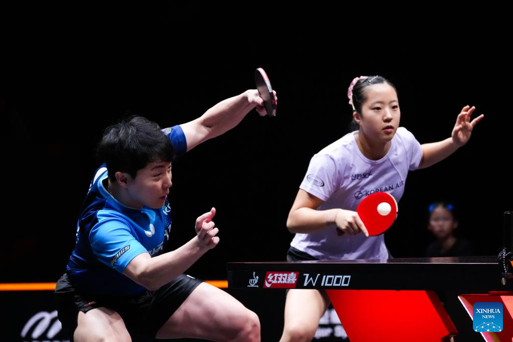 Wang Chuqin/Sun Yingsha (R) compete during the mixed doubles group 1 match between Wang Chuqin/Sun Yingsha of China and Manush Shah/Diya Chitale of India at the WTT Finals Hong Kong 2025 in Hong Kong, south China, Dec. 10, 2025. (Xinhua/Chen Duo)