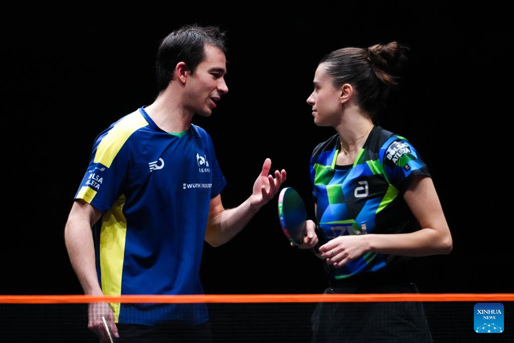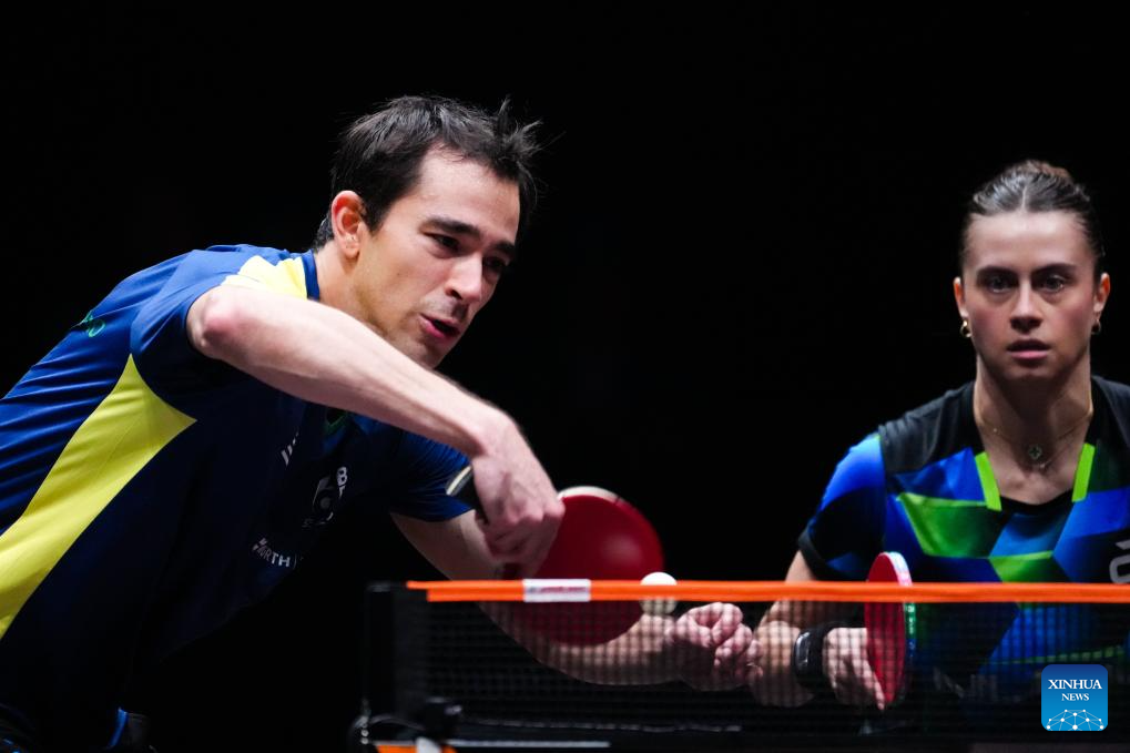 Hugo Calderano (R)/Bruna Takahashi of Brazil compete during the mixed doubles group 2 match between Lim Jonghoon/Shin Yubin of South Korea and Hugo Calderano/Bruna Takahashi of Brazil of the WTT Finals Hong Kong 2025 in Hong Kong, south China, Dec. 10, 2025. (Xinhua/Zhu Wei)
