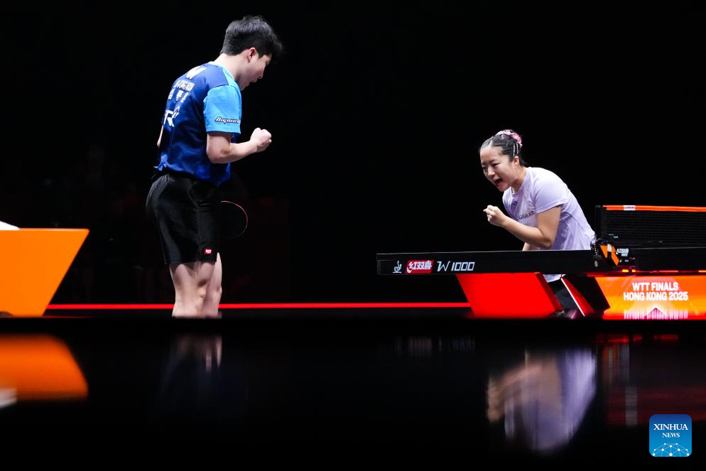 Wang Chuqin (L)/Sun Yingsha compete during the mixed doubles group 1 match between Wang Chuqin/Sun Yingsha of China and Manush Shah/Diya Chitale of India at the WTT Finals Hong Kong 2025 in Hong Kong, south China, Dec. 10, 2025. (Xinhua/Zhu Wei)