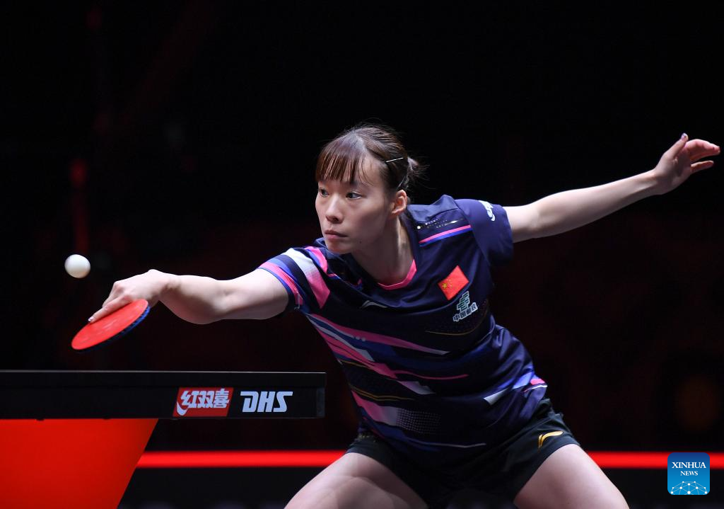 Shi Xunyao of China competes during women's singles round of 16 match between Shi Xunyao of China and Chen Xingtong of China of the WTT Finals Hong Kong 2025 in Hong Kong, south China, Dec. 10, 2025. (Xinhua/Chen Duo)