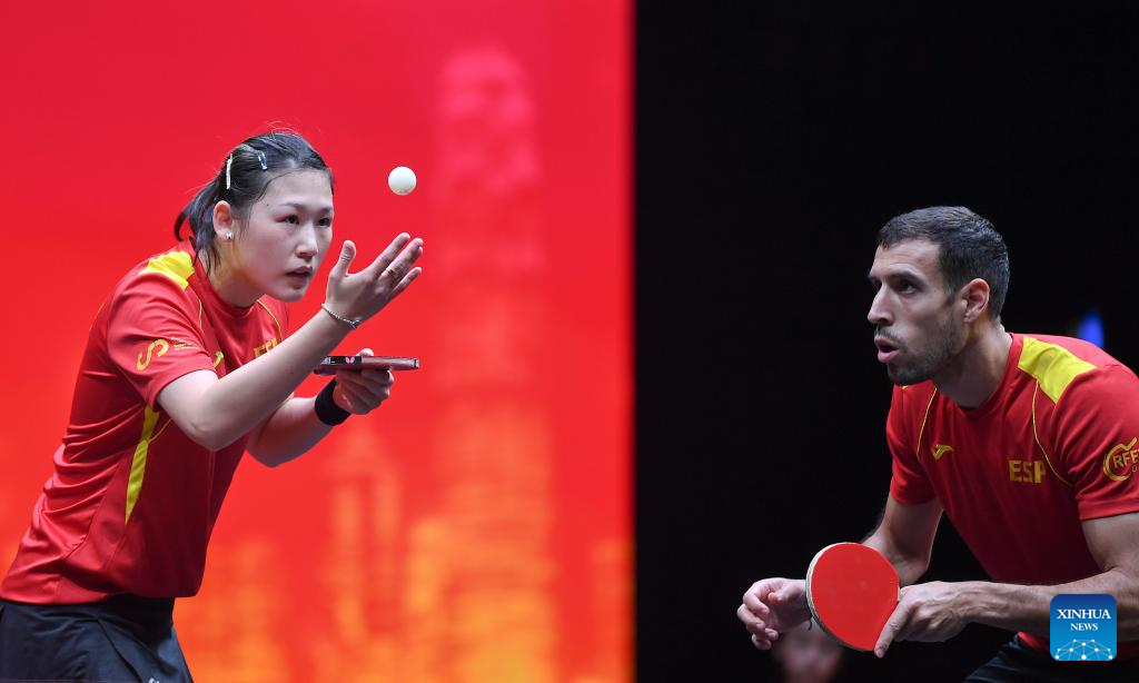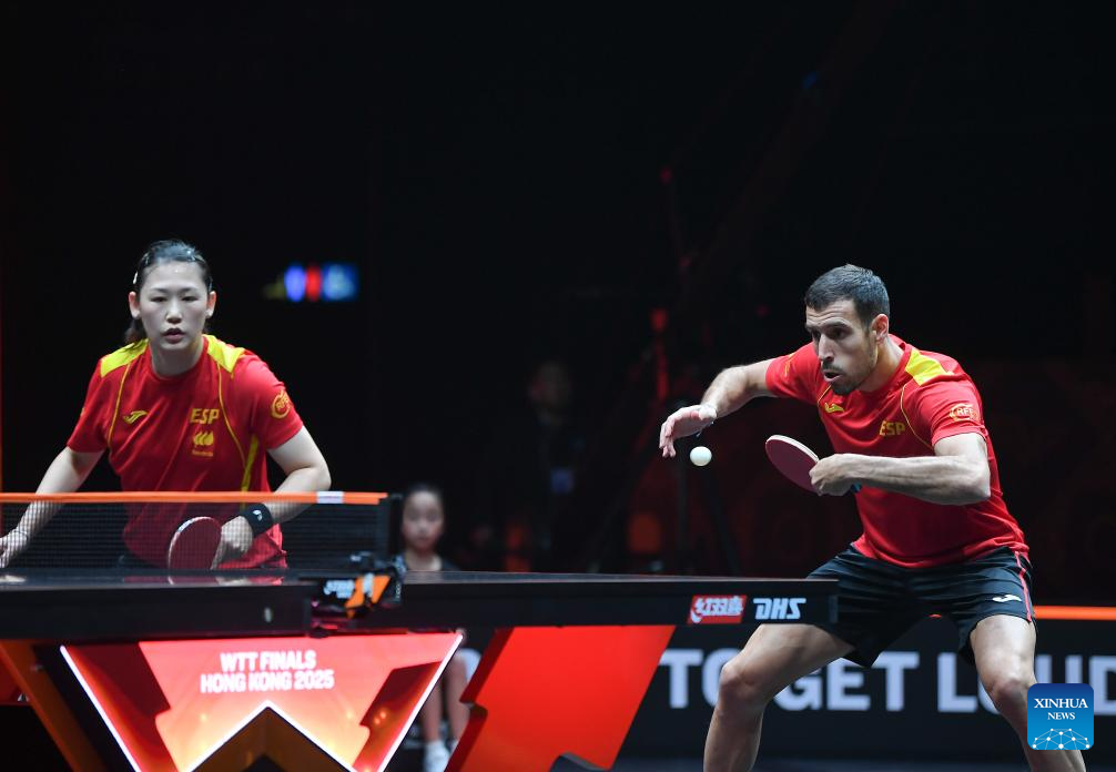 Alvaro Robles (R)/Maria Xiao of Spain compete during the mixed doubles group 2 match between Alvaro Robles/Maria Xiao of Spain and Matsushima Sora/Harimoto Miwa of Japan of the WTT Finals Hong Kong 2025 in Hong Kong, south China, Dec. 10, 2025. (Xinhua/Chen Duo)