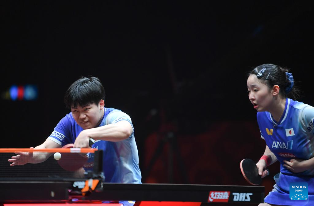 Matsushima Sora (L)/Harimoto Miwa of Japan compete during the mixed doubles group 2 match between Alvaro Robles/Maria Xiao of Spain and Matsushima Sora/Harimoto Miwa of Japan of the WTT Finals Hong Kong 2025 in Hong Kong, south China, Dec. 10, 2025. (Xinhua/Chen Duo)