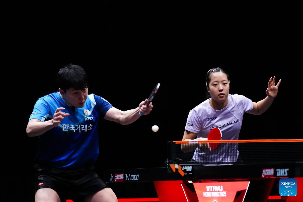 Lim Jonghoon (L)/Shin Yubin of South Korea compete during the mixed doubles group 2 match between Lim Jonghoon/Shin Yubin of South Korea and Hugo Calderano/Bruna Takahashi of Brazil of the WTT Finals Hong Kong 2025 in Hong Kong, south China, Dec. 10, 2025. (Xinhua/Zhu Wei)