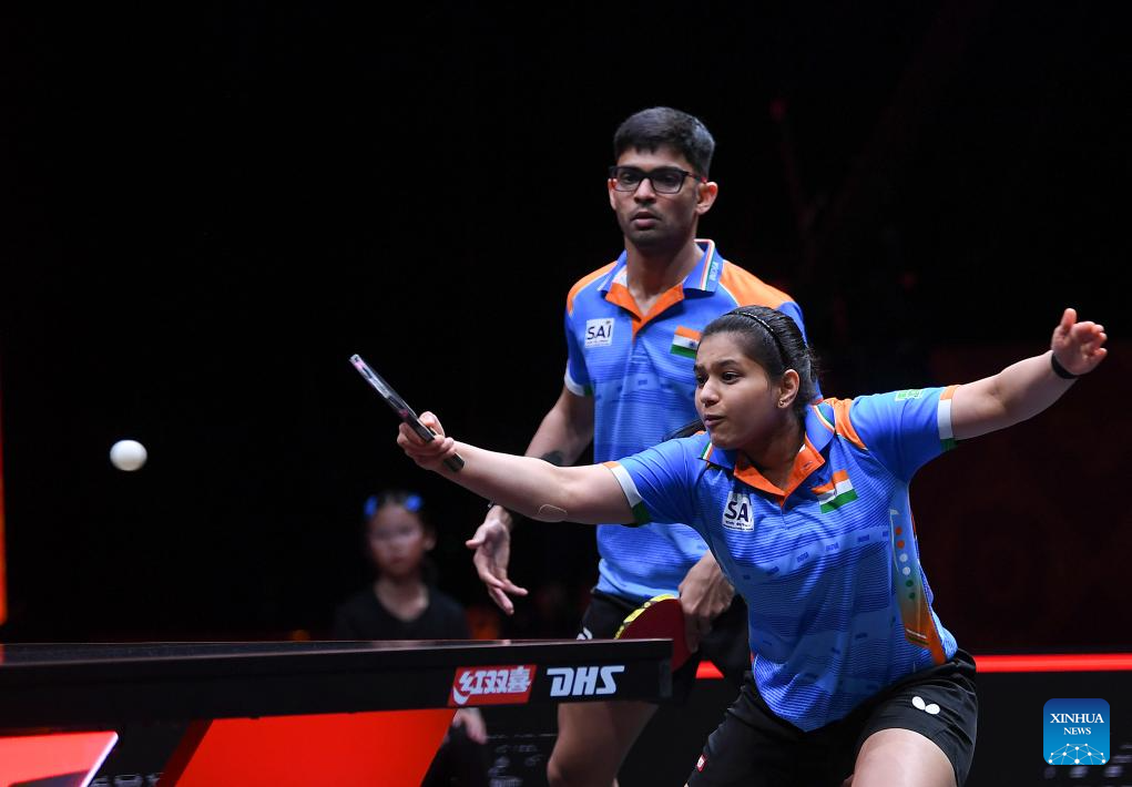 Manush Shah (L)/Diya Chitale compete during the mixed doubles group 1 match between Wang Chuqin/Sun Yingsha of China and Manush Shah/Diya Chitale of India at the WTT Finals Hong Kong 2025 in Hong Kong, south China, Dec. 10, 2025. (Xinhua/Chen Duo)