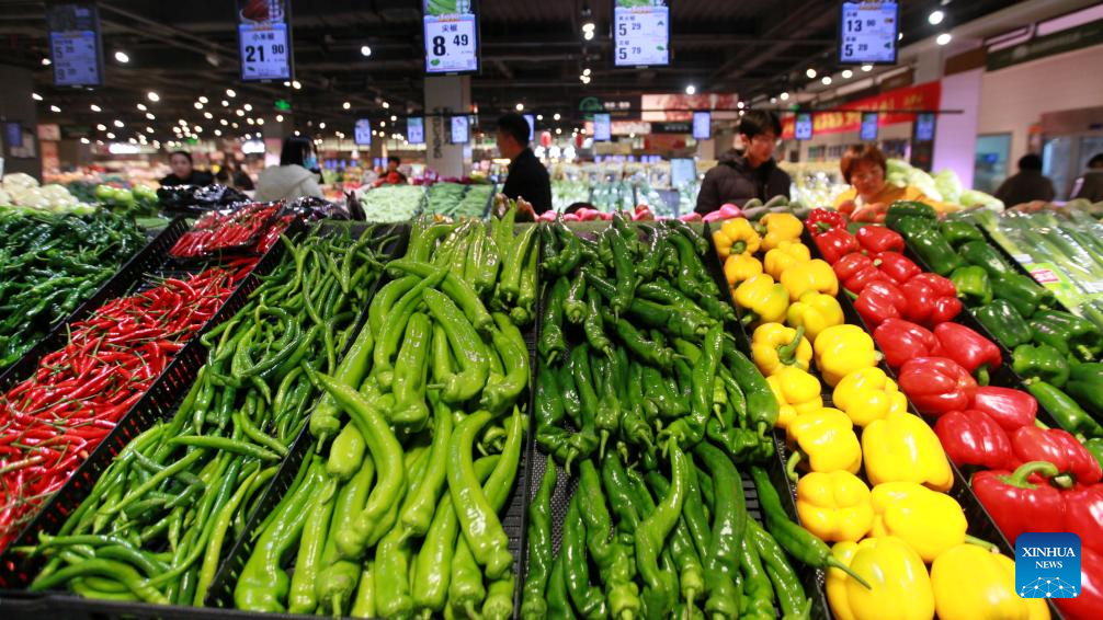 Customers select vegetables at a supermarket in Tancheng County, east China's Shandong Province, Dec. 10, 2025. China's consumer price index (CPI), a main gauge of inflation, grew at a faster pace in November, driven by rising food prices, official data showed Wednesday.