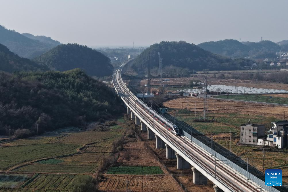An aerial drone photo taken on Dec. 26, 2025 shows the C3132 passenger train bound for Hangzhou running along the Hangzhou-Quzhou high-speed railway in east China's Zhejiang Province. The 131-km high-speed railway connecting the cities of Hangzhou and Quzhou in Zhejiang was put into operation on Friday. (Xinhua/Huang Zongzhi)